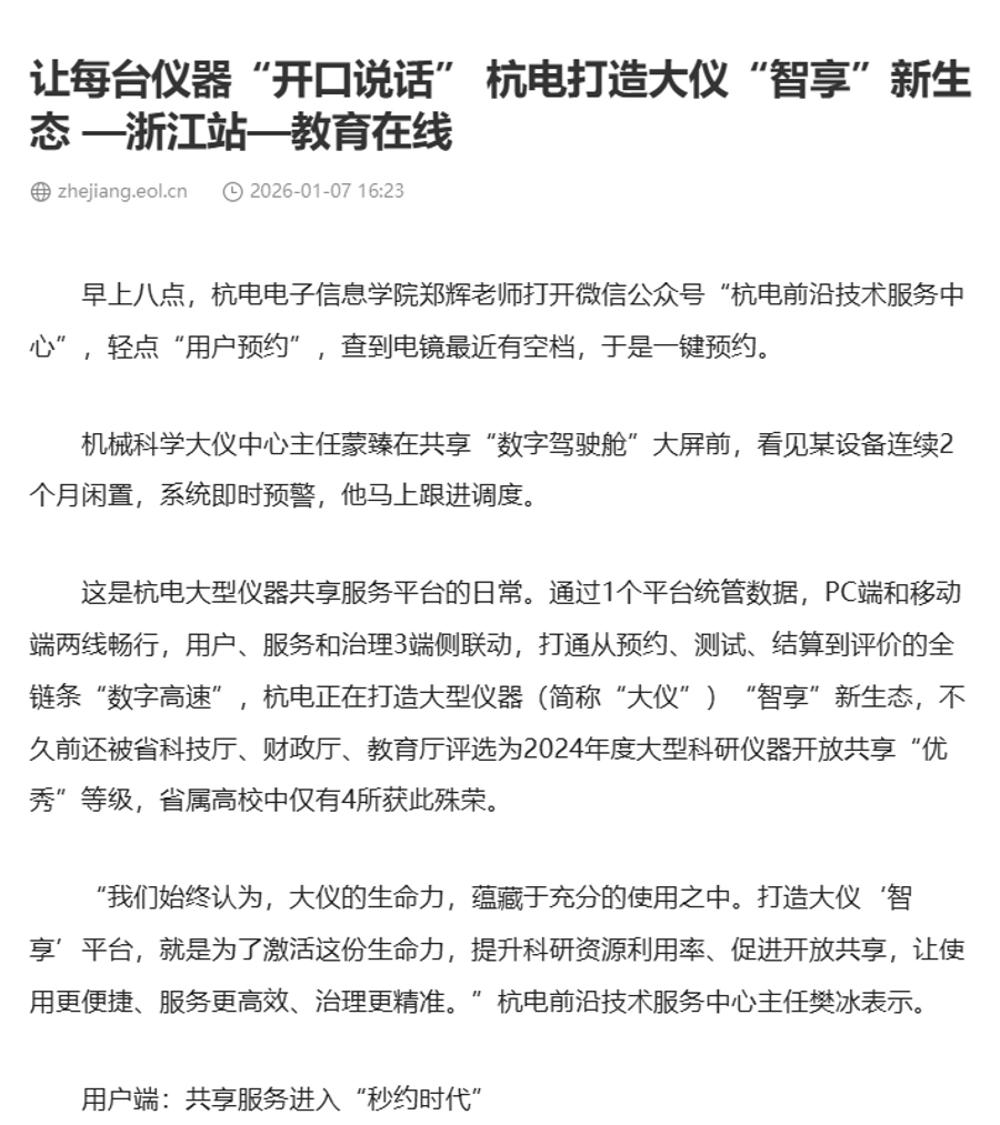 教育在线报道——让每台仪器“开口说话” 杭电打造大仪“智享”新生态